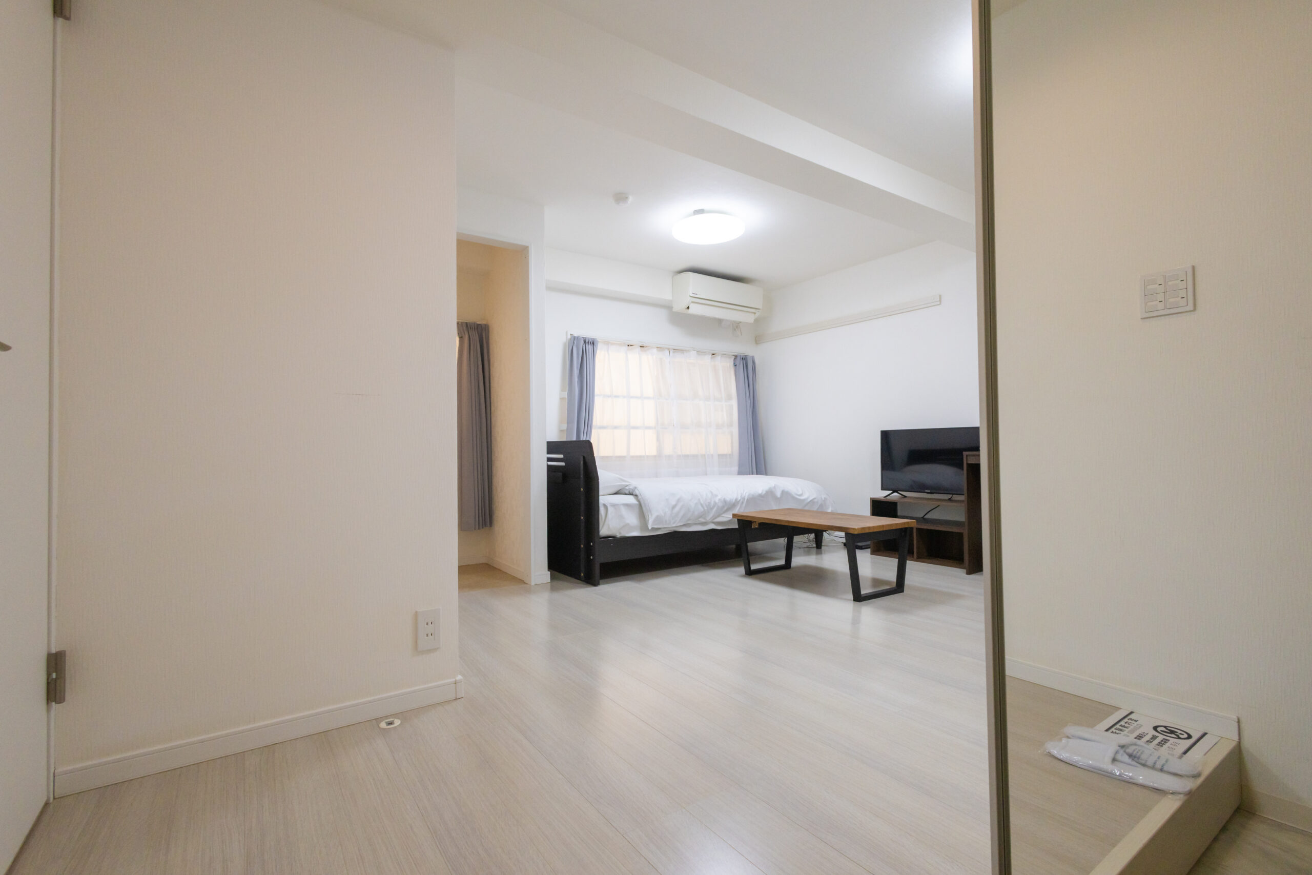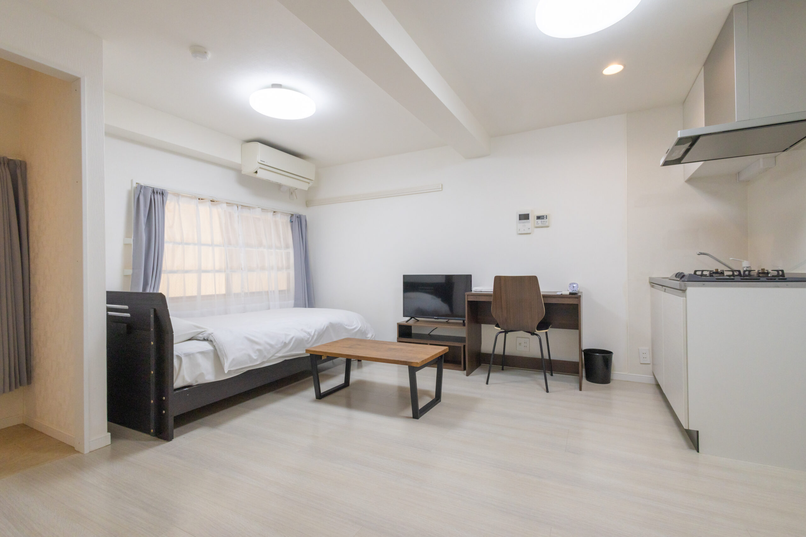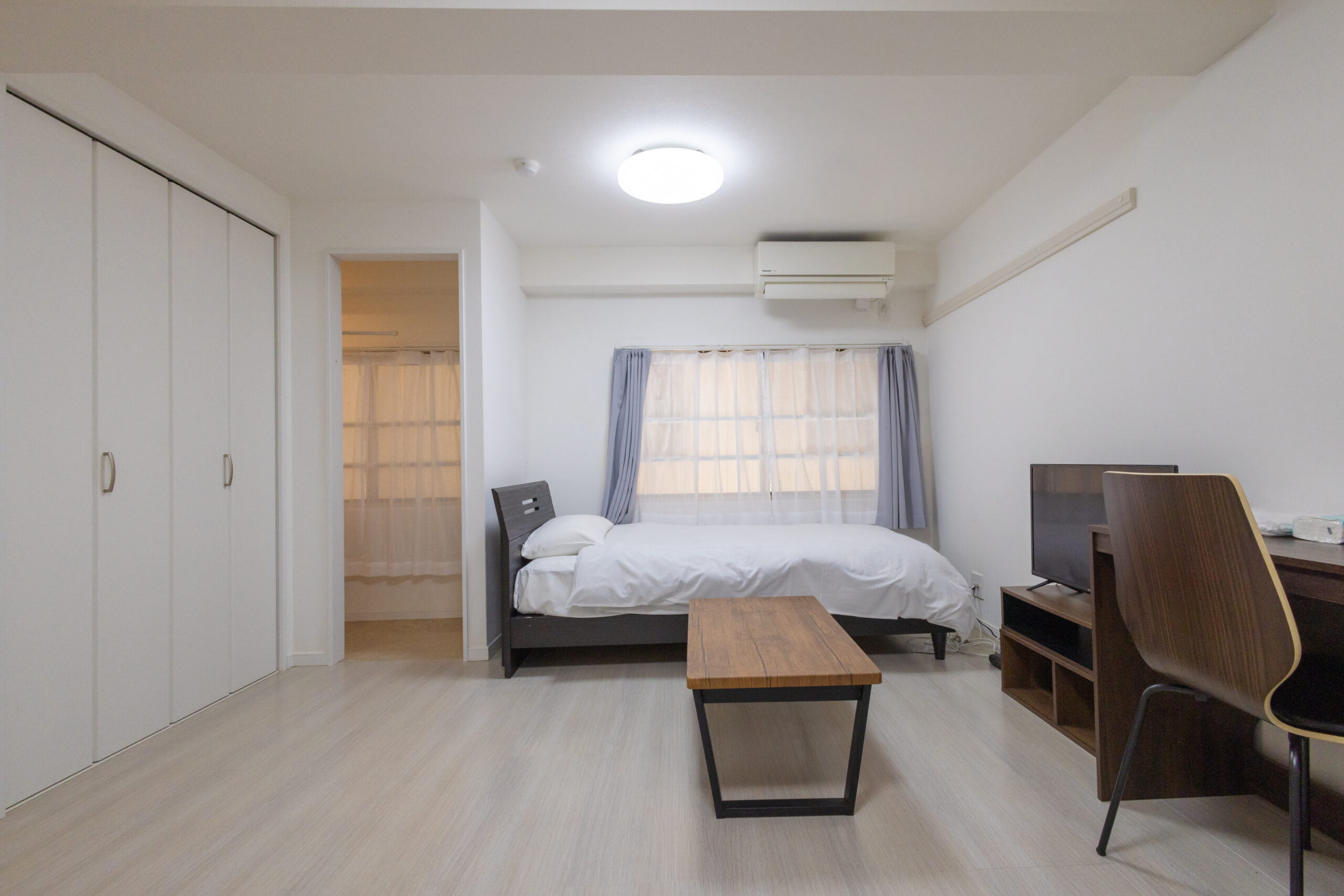 家具イス、カーテン付き、シーツ類、テーブル、テレビ台、デスク、ベッド、寝具一式