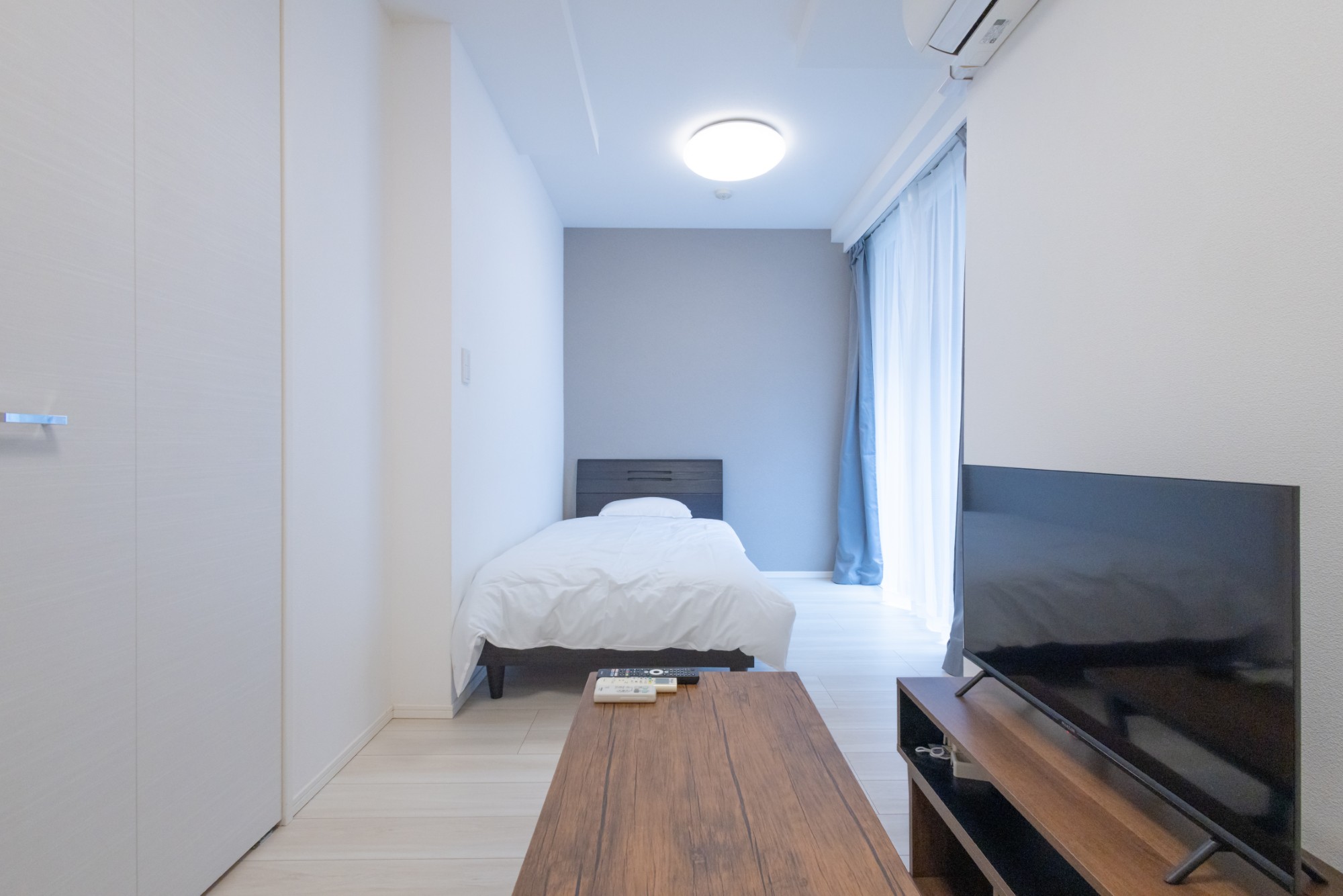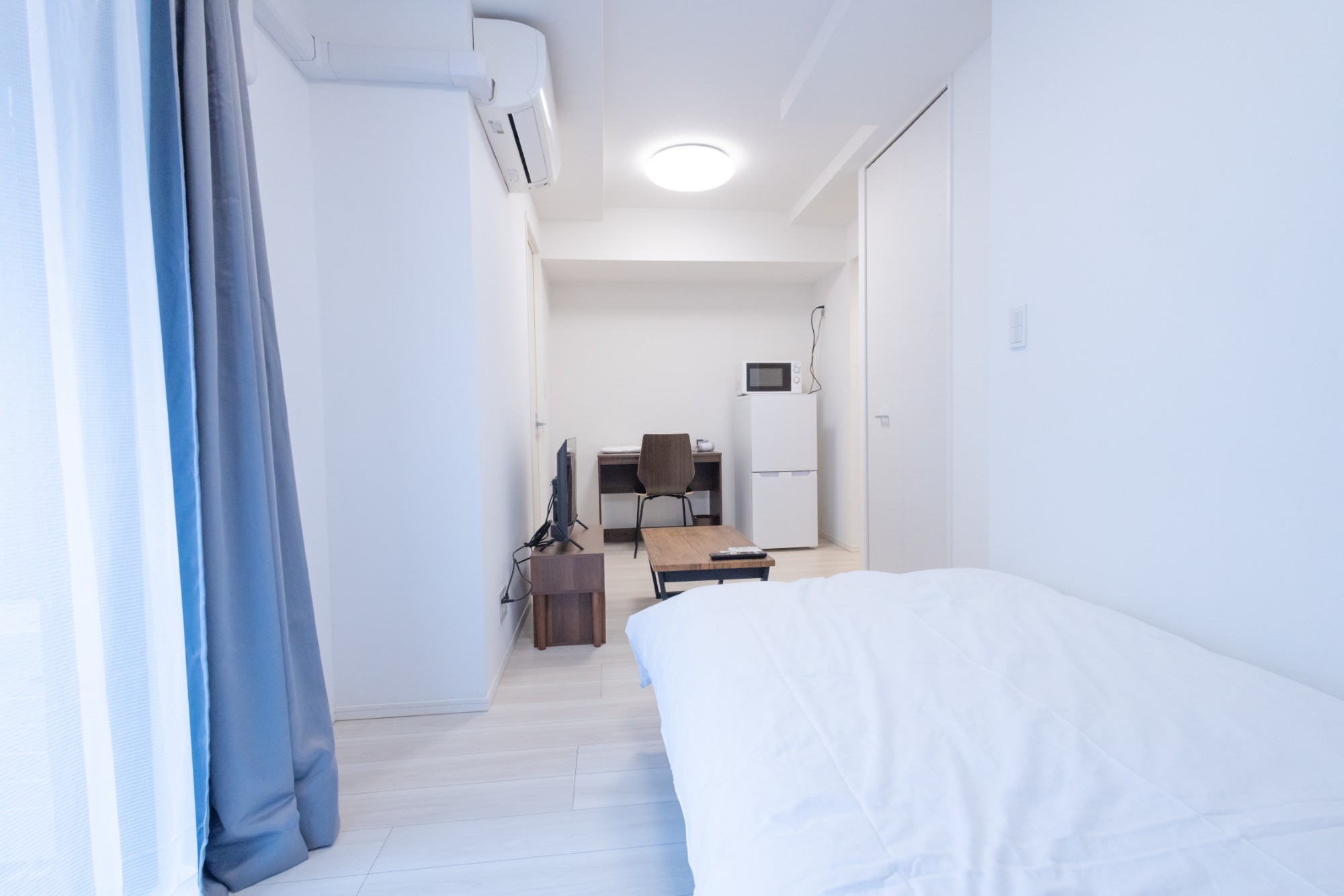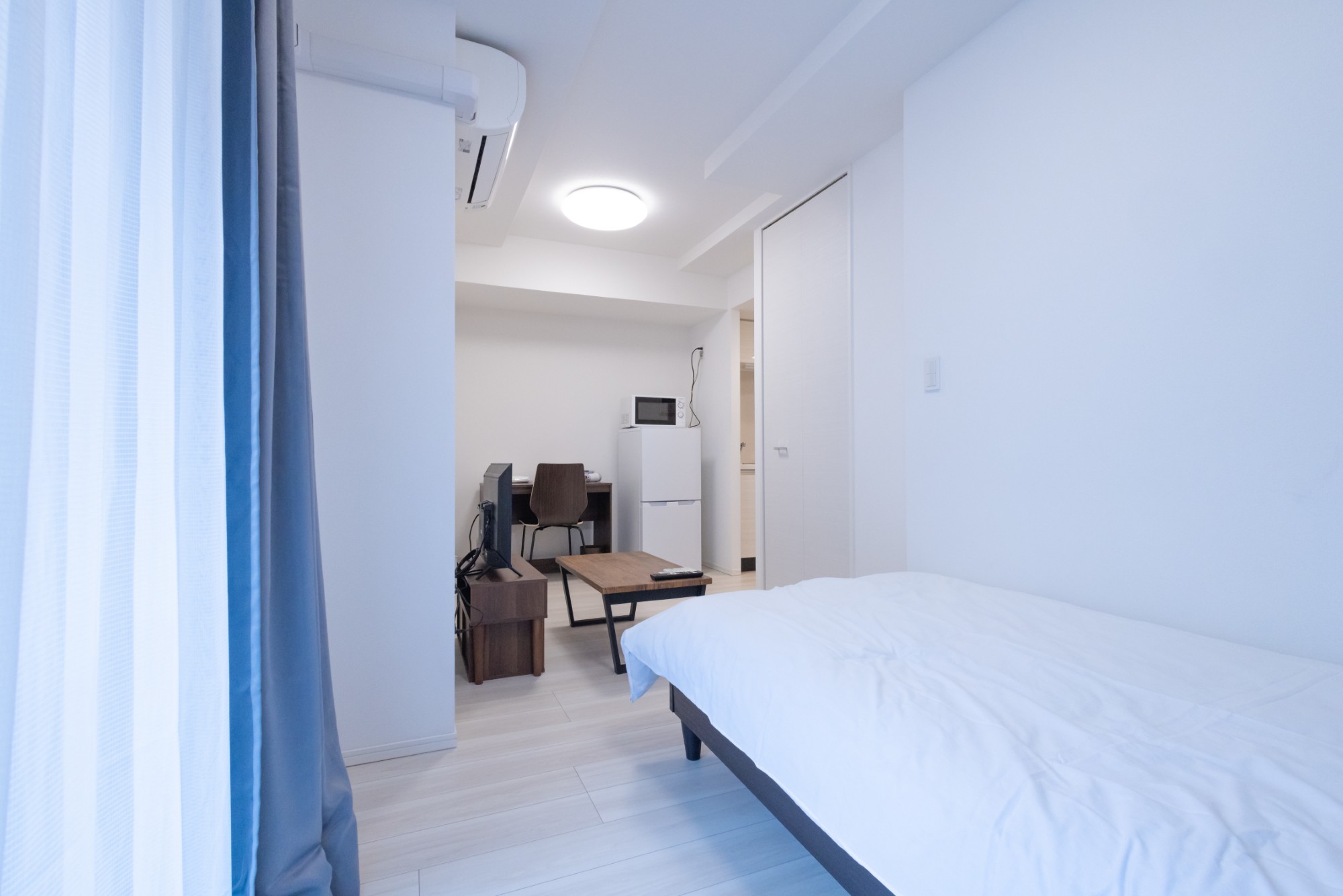 | 家具 | イス、カーテン付き、シーツ類、テーブル、テレビ台、デスク、ベッド、寝具一式 |
