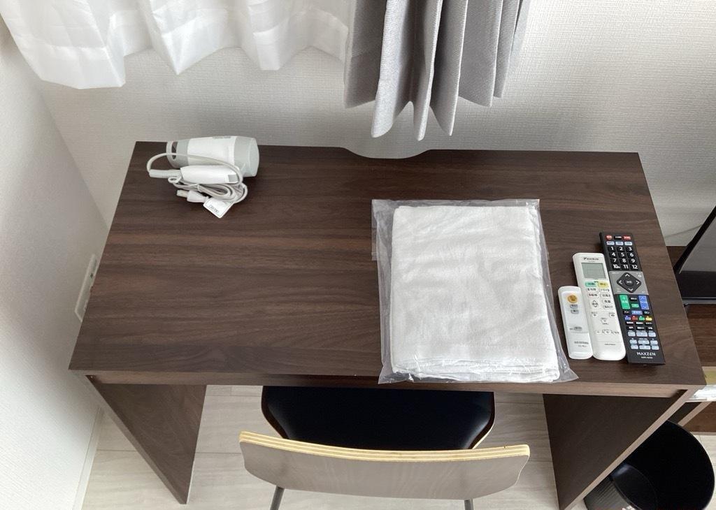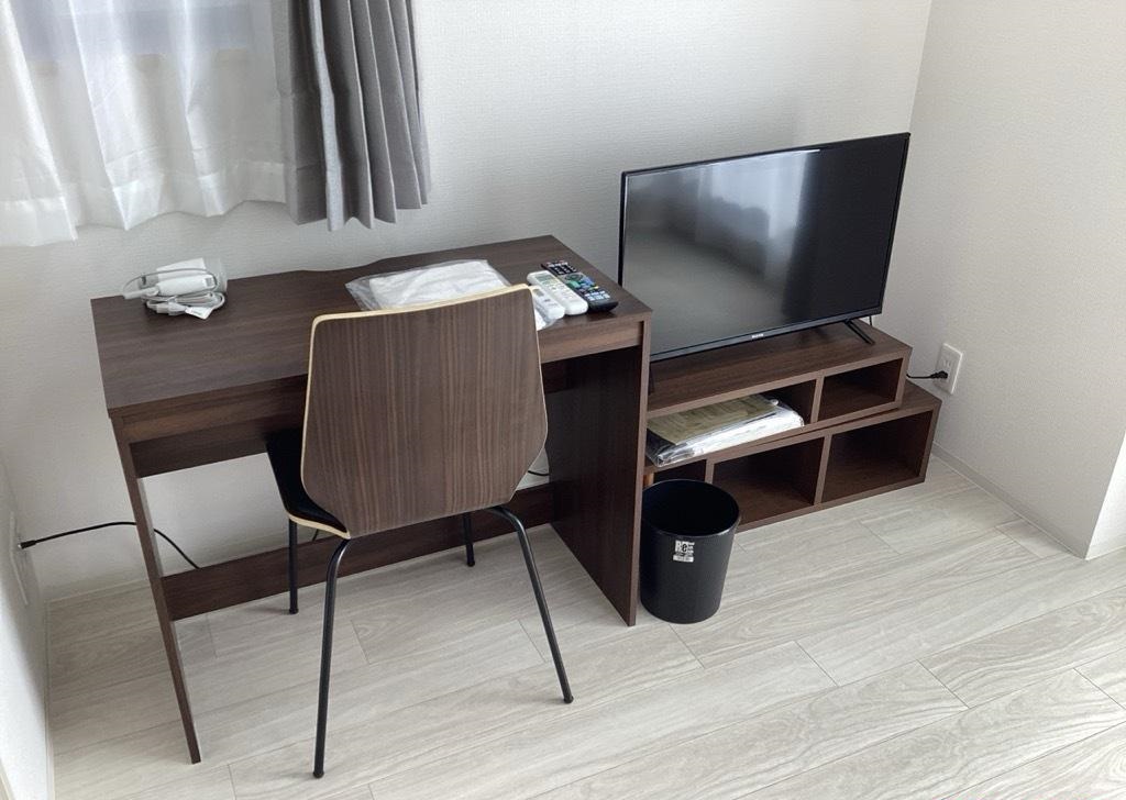 | 家具 | イス、カーテン付き、シーツ類、サイドテーブル、テレビ台、デスク、ベッド、寝具一式 |