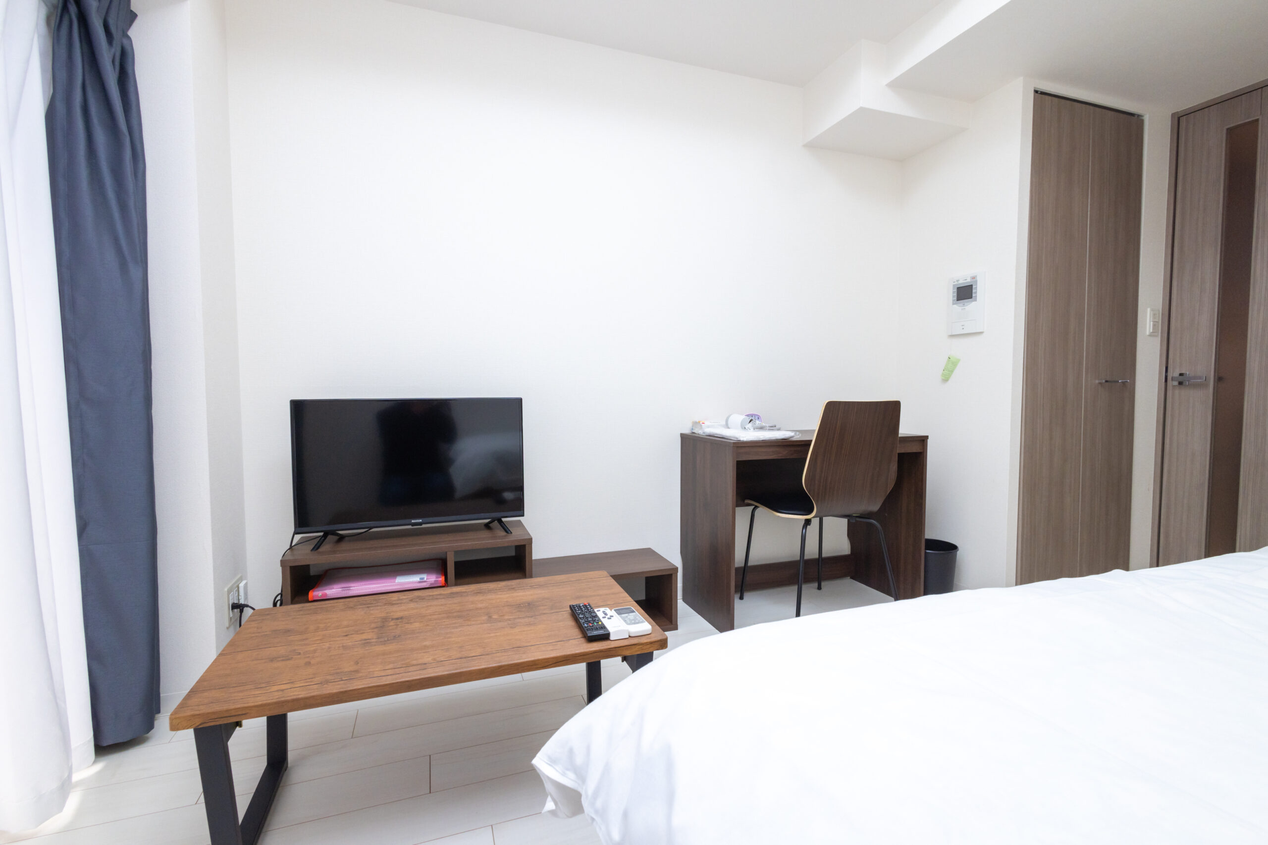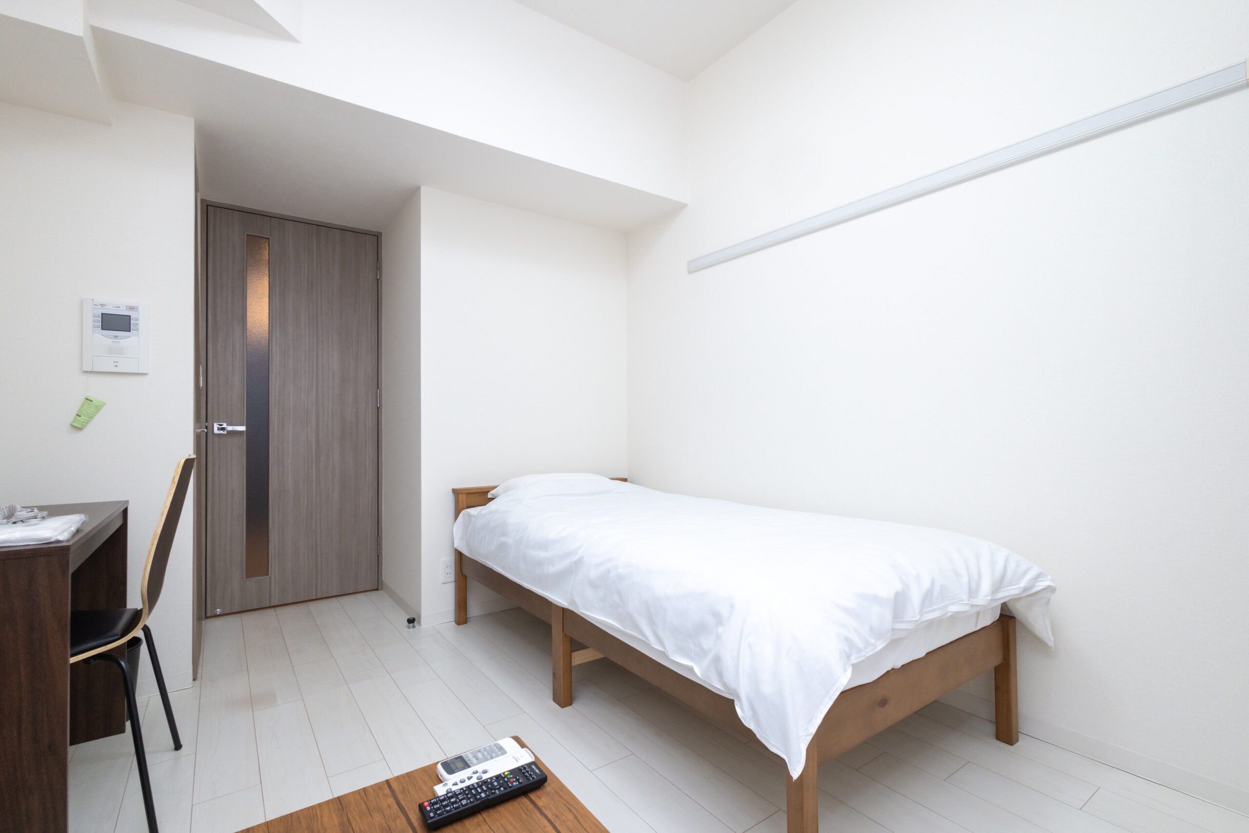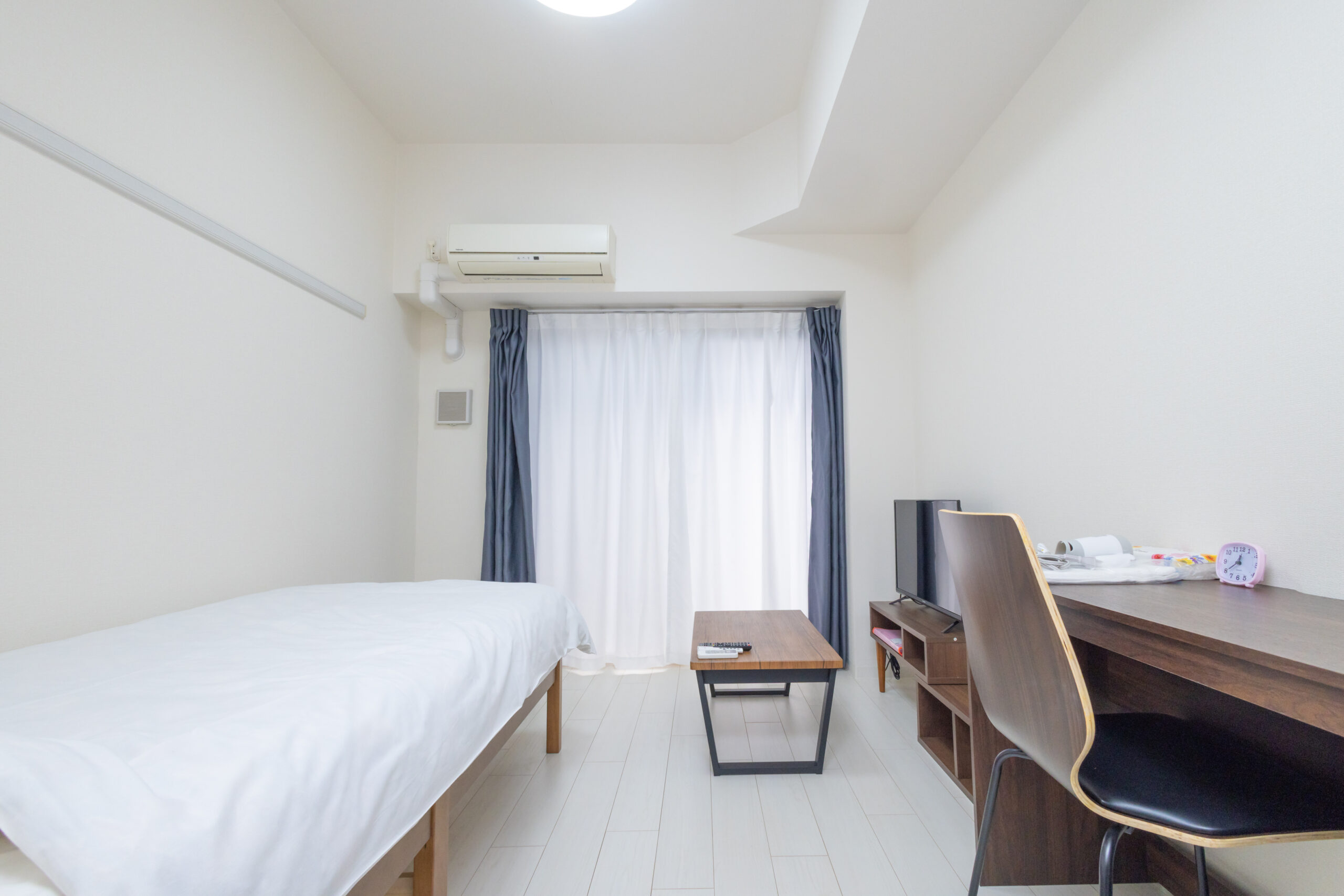 | 家具 | イス、カーテン付き、シーツ類、テーブル、テレビ台、デスク、ベッド、寝具一式 |