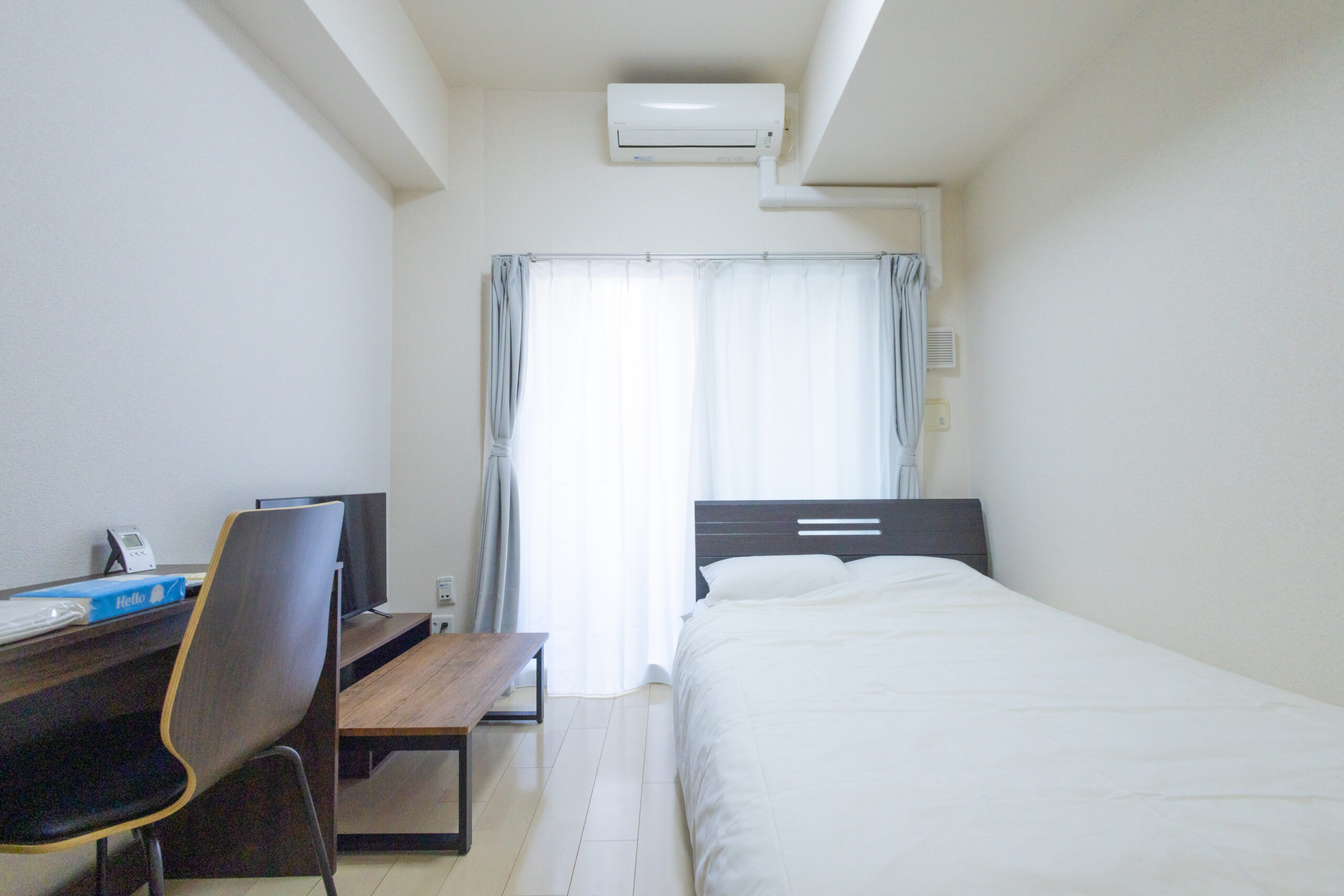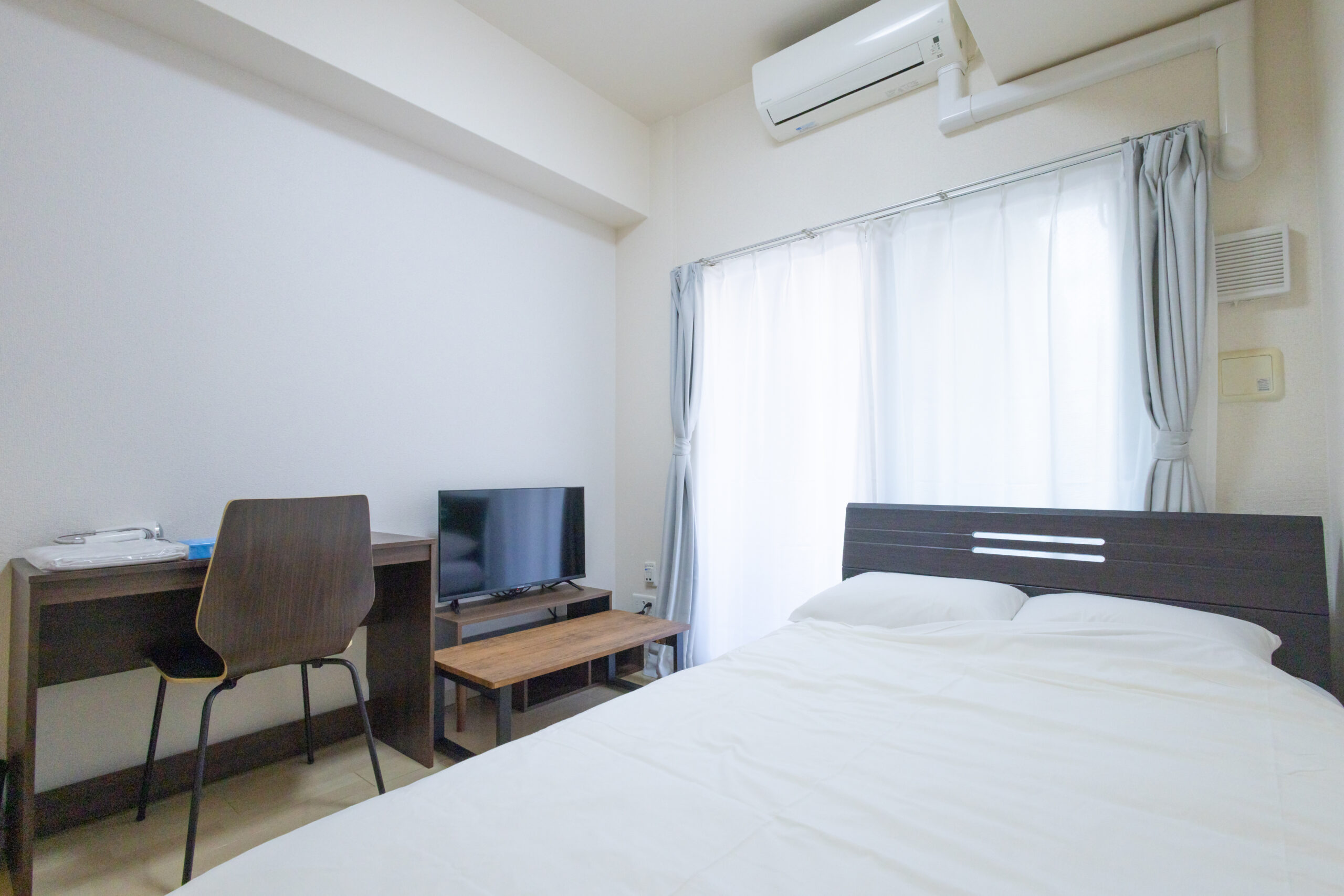 家具イス、カーテン付き、シーツ類、テーブル、テレビ台、デスク、ベッド、寝具一式
