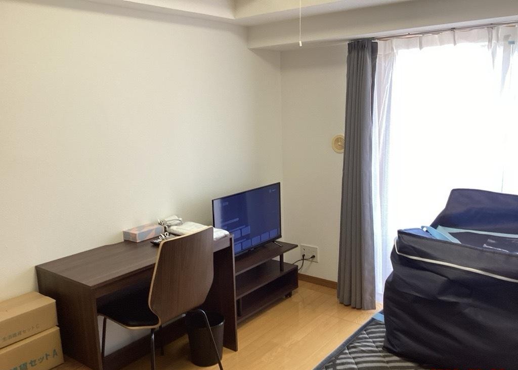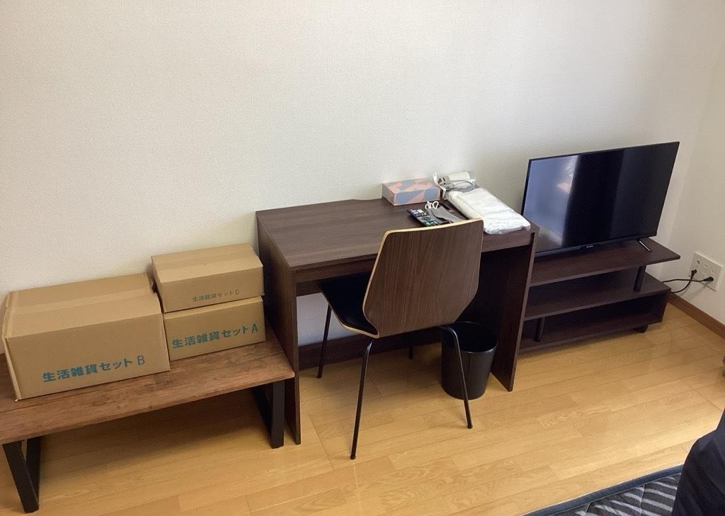 | 家具 | イス、カーテン付き、シーツ類、テーブル、テレビ台、デスク、ベッド、寝具一式 |