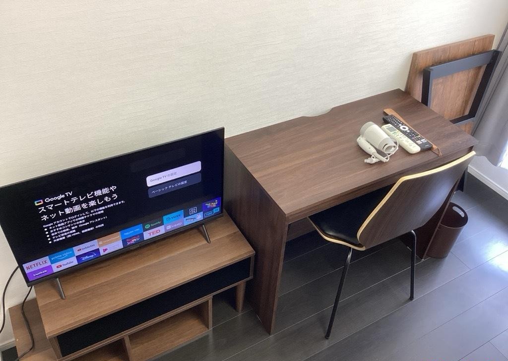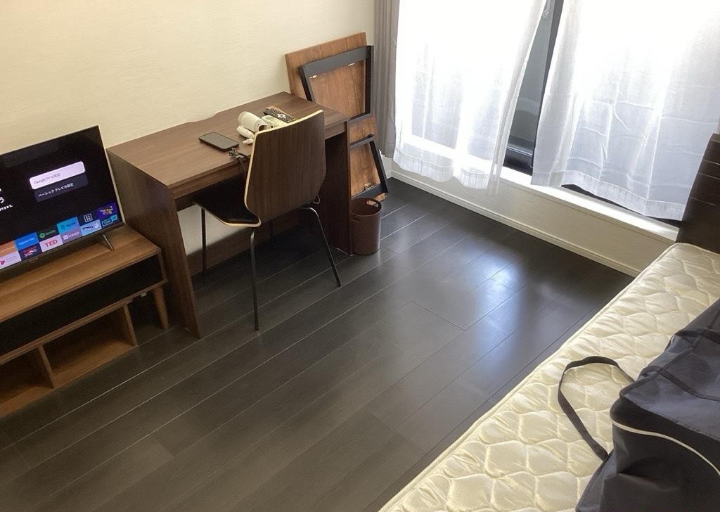 家具イス、カーテン付き、シーツ類、テーブル、テレビ台、デスク、ベッド、食器棚、寝具一式